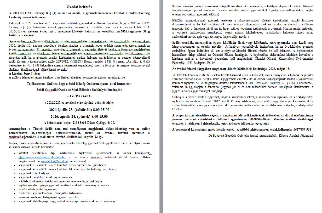 ÓVODAI BEIRATKOZÁSI TÁJÉKOZTATÓ 2026/2027