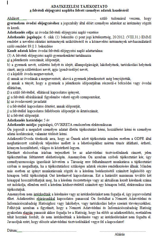 Szeretettel várjuk leendő óvodásainkat a beiratkozás 2 napján. Ezen a két napon lehetőséget biztosítunk az óvoda külső-belső megtekintésére. Tájékoztatást kaphatnak az intézmény működésével kapcsolatos kérdéseikre. Kérjük, hogy a beiratkozásra szíveskedjenek hozni - már kitöltve - a feltüntetett dokumentumokat: felvételi kérelem, adatvédelmi nyilatkozat. A dokumentumok elérhetőek itt a honlapon. E mellett a gyermek oltási kiskönyvét, és a gyermek iratait. Köszönjük.