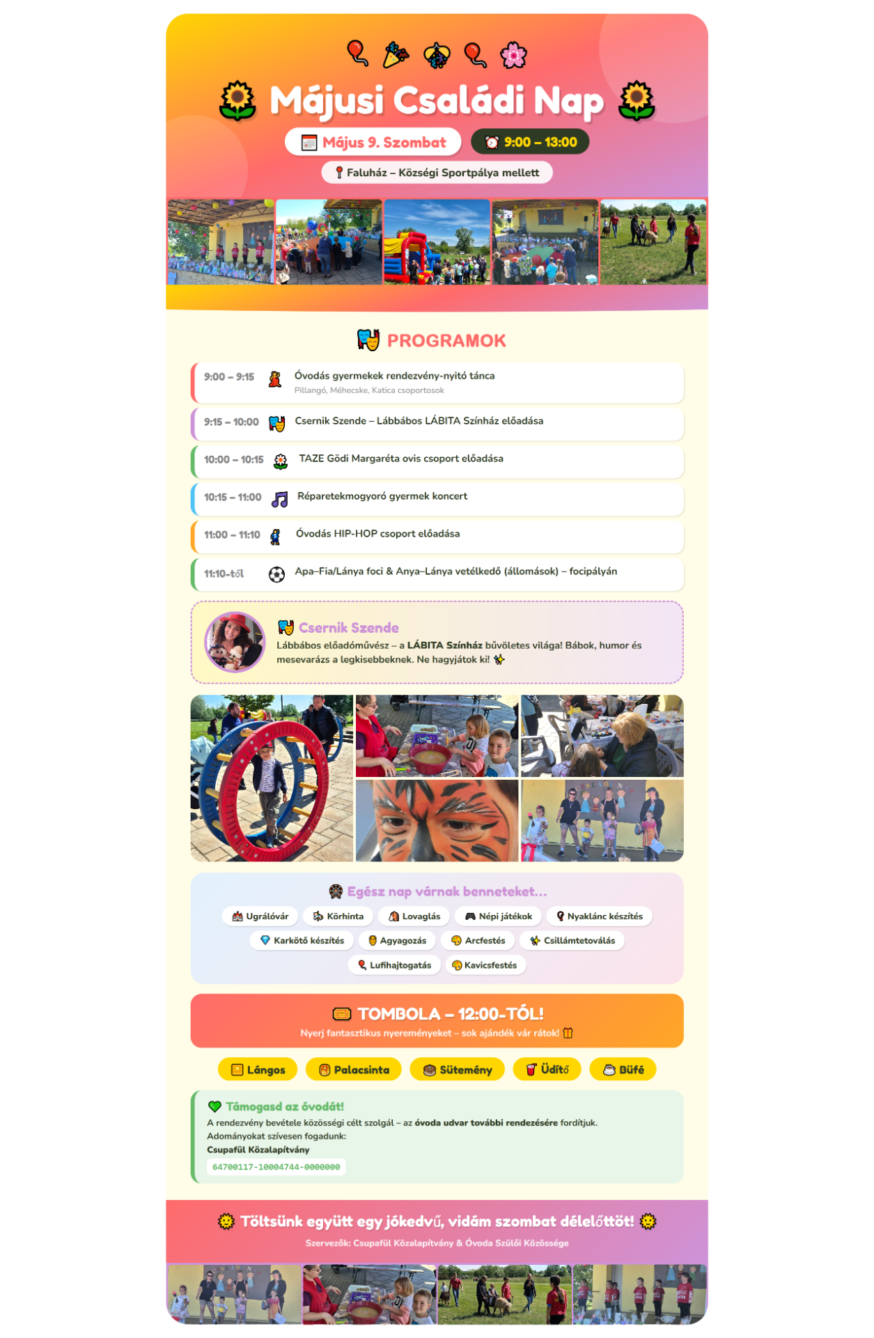 Szeretettel várunk minden kedves sződi családot május 9-én, egy szórakoztató szombat délelőttre.